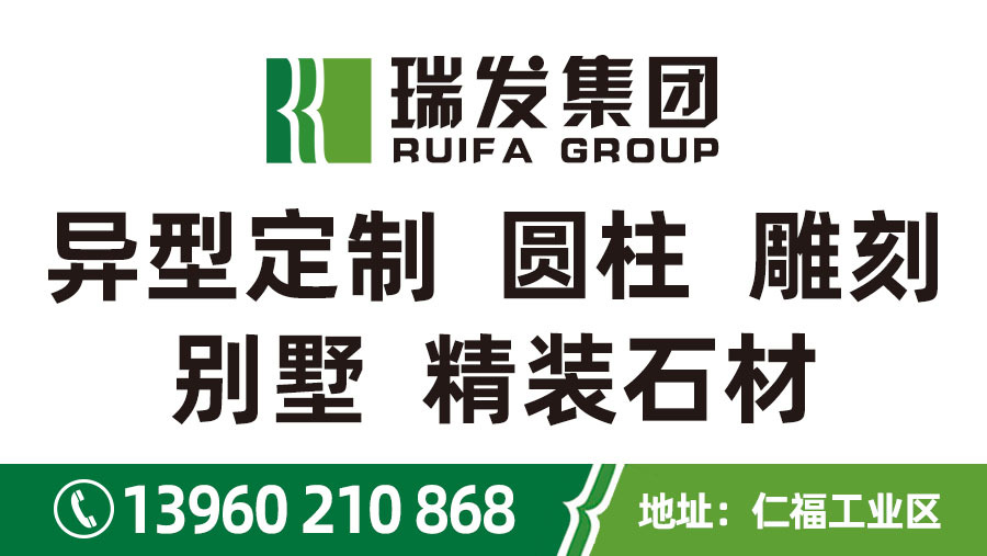 瑞发控股集团地处闽南金三角,全国最大的石材生产基地--南安水头。经过多年不断的创新,已发展成为一家集石材开采销售、生产加工、进出口贸易、建筑、幕墙装饰、房地产等多领域产业于一体的多元化、综合型企业。 瑞发集团旗下有:福建省南安市瑞刚石材有限公司、福建瑞发投资有限公司、福建瑞发幕墙有限公司、福建瑞发传媒有限公司、福建瑞发农业有限公司,并在全国各省市及欧美、巴西、印度、土耳其、意大利等石材原产地设立分公司及办事处。 瑞发集团公司成立于1992年,秉承“立信为本、品质为先、顾客至上”的经营理念,以良好的信誉、完善的服务、优质的产品赢得了广大客户及社会各届的一致好评。 瑞发集团在致力于开发新产品的同时,也未松懈对品质的高要求。公司以“顾客满意”为核心,注重“内炼素质、外树形象“,已全面通过IS09001:2015国际质量管理体系认证和IS014001:2015环境管理体系认证;严格按照国标GB/T18601-2009执行产品检验。公司连续多年被评为“守合同,重信用'“、”AAA信用企业“、”纳税大户“、”明显企业“、”福建著名商标“等荣誉称号。公司注重企业的形象建设,已全面导入CIS战略及网络的建立,为实现企业的高层次、国际化、规模化的发展,迈出了坚定的步伐 "质量卓越,服务完美”是我们的宗旨,为您提供最完善的服务及最优质的产品--是我们最诚挚的承诺!主营产品 异型定制,圆柱,雕刻,别墅,精装石材 |